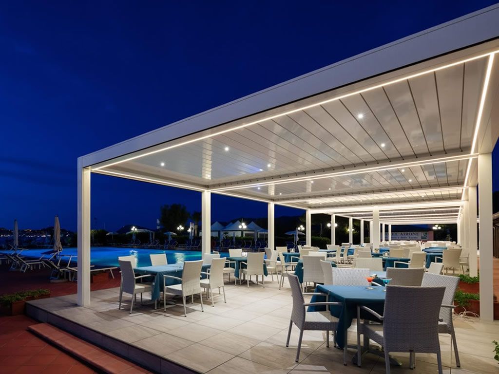 - Pérgolas con iluminación LED integrada, imprescindibles para servicio nocturno.