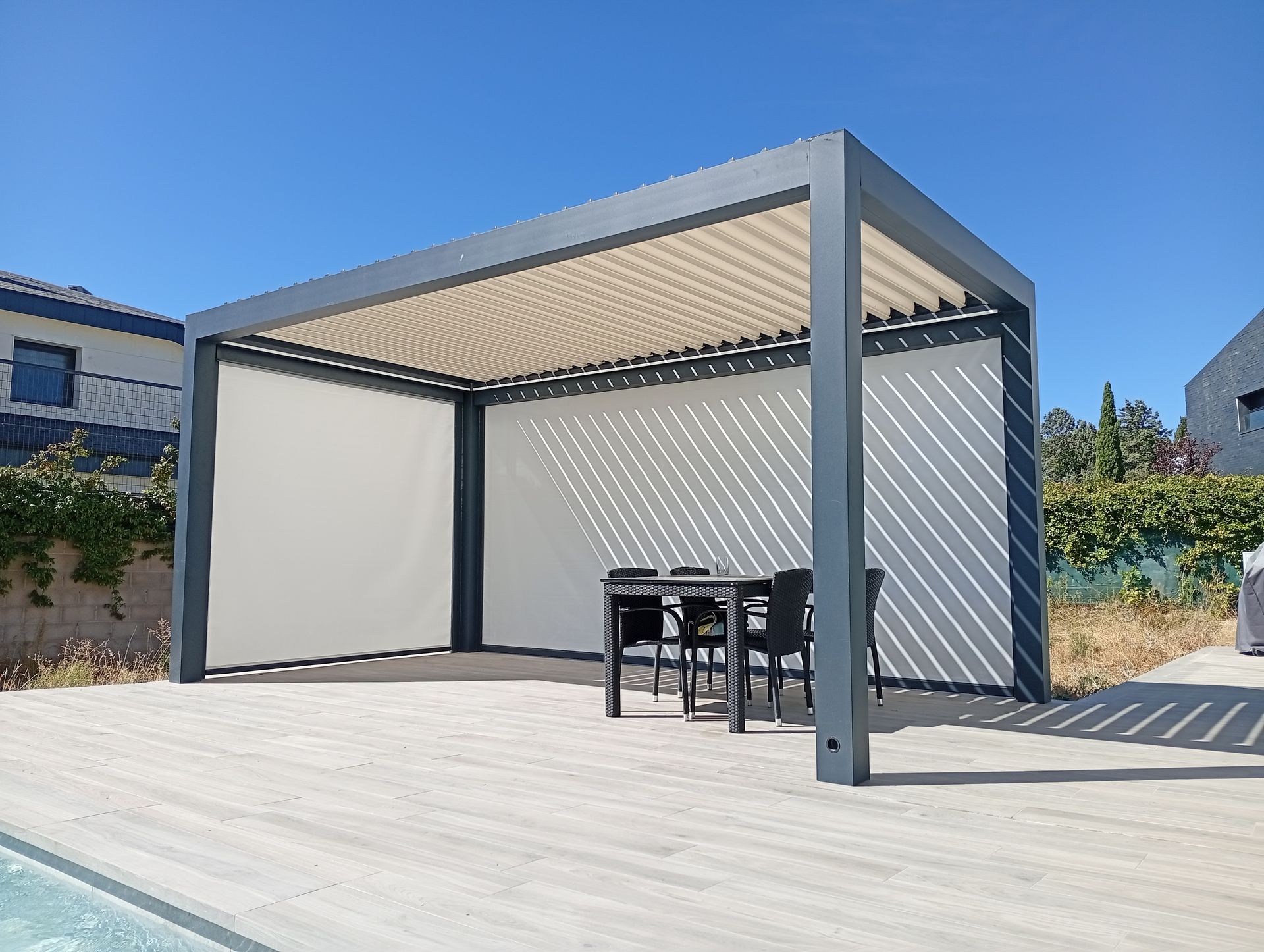 Su estructura estable y su diseño elegante ofrecen una cobertura eficaz frente al sol y la lluvia, creando ambientes agradables durante todo el año. Esta opción combina funcionalidad con una presencia visual atractiva, adaptándose fácilmente a distintos entornos.